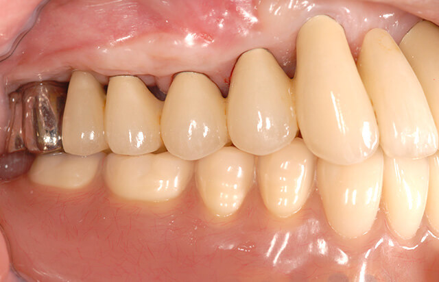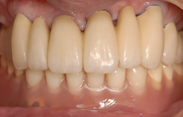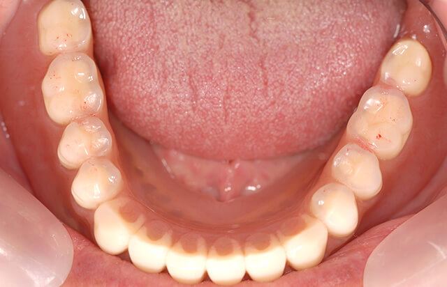 上顎は、歯の動揺を再生療法による歯槽骨の回復と全ての歯を連結固定することで改善しました。歯の位置の不正は、矯正治療により改善しました。下顎は、2本の歯を保存することができましたが、歯根が弱いため歯根のみを残し総義歯内面の磁石を装着し義歯の維持を強化しています。歯周組織は、歯周外科により歯肉が強化され厚みのある歯肉を獲得でき、非常にブラッシングしやすい環境が整備されました。
